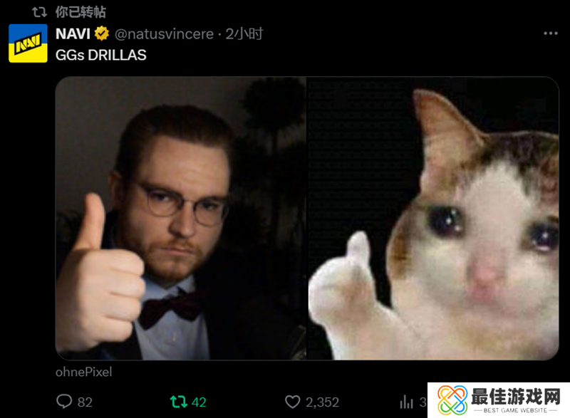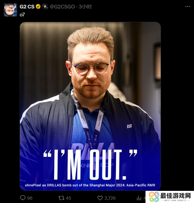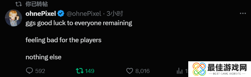 在社交平台上,ohnePixel写道:GG,祝现在还没被淘汰的队伍们好运。