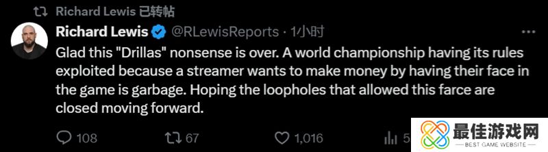 Richard Lewis:很高兴这场“Drillas”闹剧结束了。因为主播想通过在游戏中露脸来赚钱,进而利用世界大赛的规定,这一点真的太糟糕了。希望导致这场闹剧的漏洞能在未来被堵住。