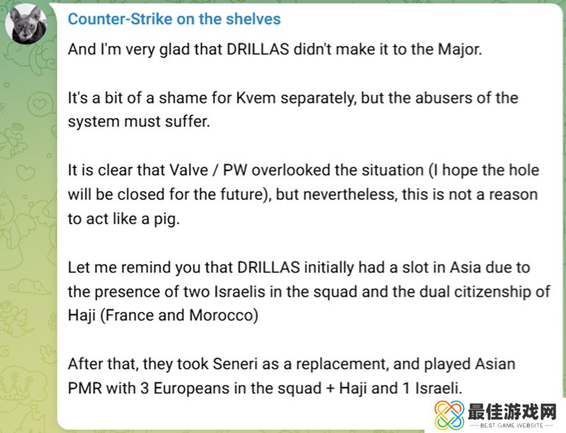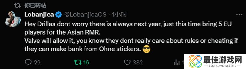 Valve会允许这样做,你知道如果他们能从Ohne(注:DRILLAS教练Ohnepixel是国外顶级网红)贴纸上赚钱,他们并不真正关心规定或作弊。