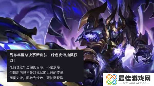 根据博主透露的消息,吕布这款年度总决赛专属皮肤的配色是绿色,皮肤的品质是史诗限定,据说这款皮肤需要通过抽奖的方式才能过获得,因此皮肤的价格估计也不会便宜。