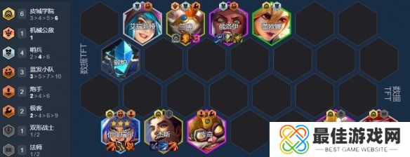 标准阵容:6哨兵1公敌4皮城3蓝发2炮手2极客
