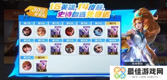 1、30日登陆礼:登陆游戏签到即可领取英雄角色及皮肤,连续30天签到,每日可领取英雄或皮肤。