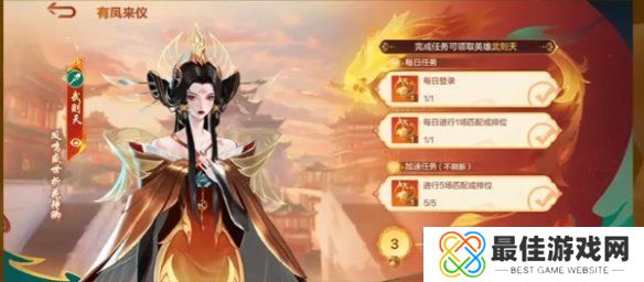 4、有凤来仪:完成武则天专属任务,可免费获得新英雄“武则天”,每天排位或匹配预计3-4天即可获得。