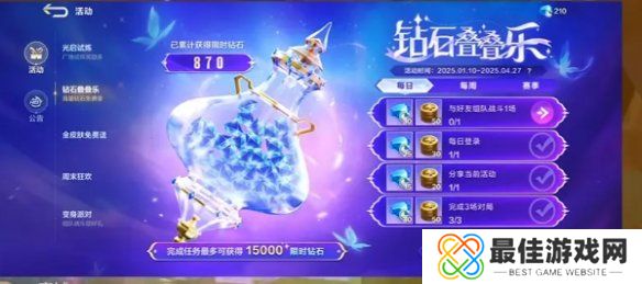 5、钻石叠叠乐:参加钻石叠叠乐活动,每日可领取100钻石,最高可获得15000钻石,可用于商城消费。