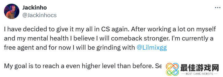 “我决定再次全力以赴地投入CS。在经过大量自我提升和关注心理健康后,我相信我会以更强的姿态回归。目前我是一名自由选手,现在会与