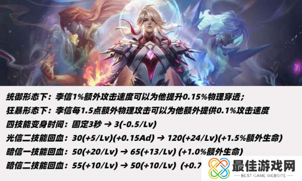 ①李信光明形态:每1%额外攻速提升0.15%物理穿透,二技能回血提升基础数值,AD加成改为额外生命值加成。