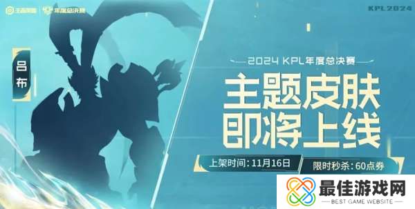 吕布KPL年度总决赛主题皮肤,将于11月16日零点上架,售价60点券,目前海报建模和技能特效暂未公布。