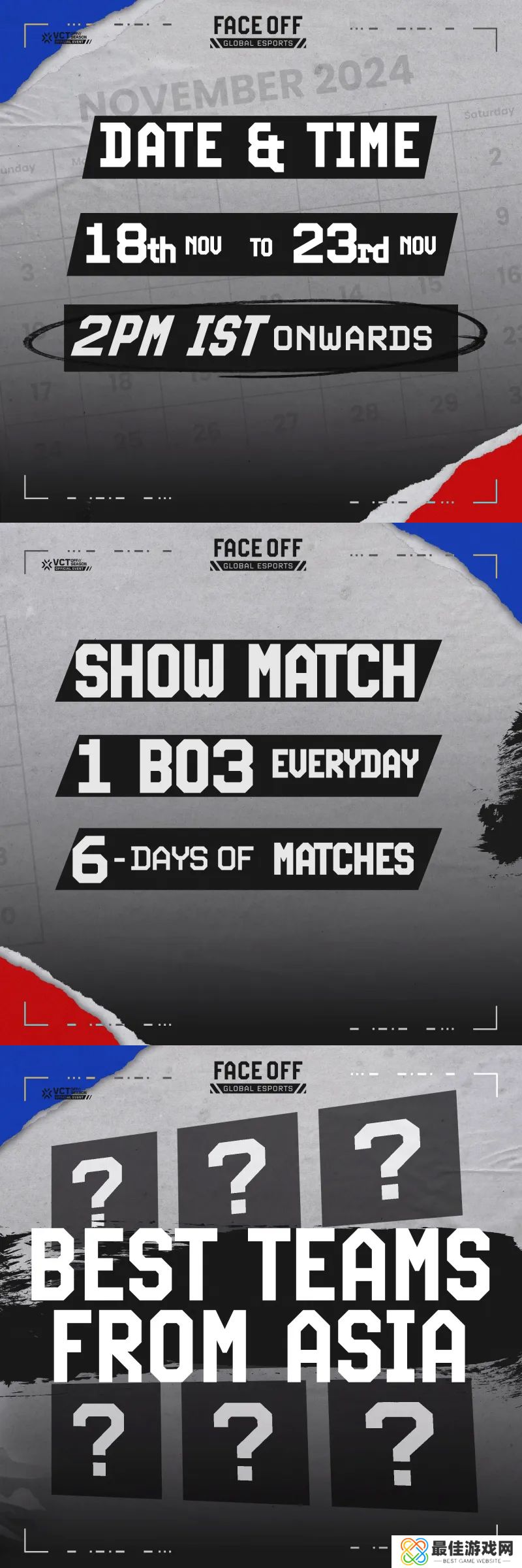VCT 太平洋联赛的战队Global Esports官宣将举办休赛期锦标赛“Face Off”。比赛日期为2024年11月18日至2024年11月23日,为期六天,每天将举办一场BO3,将邀请六支来自