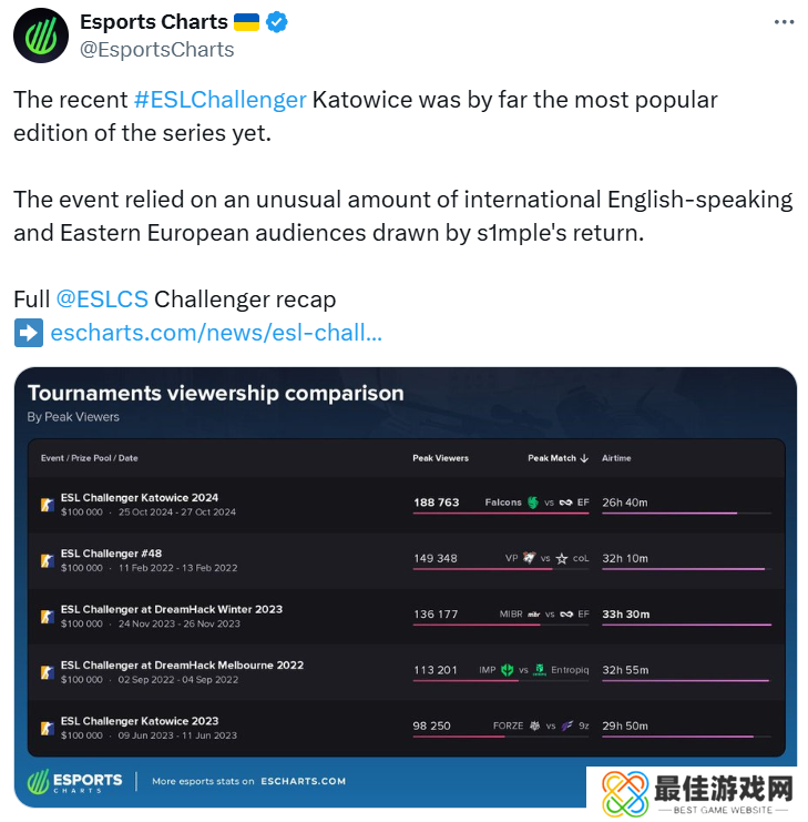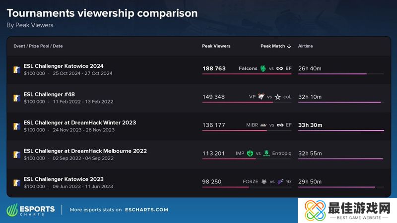 根据外媒Esports Charts的数据显示,最近的ESL 挑战者 卡托维兹站无疑是该系列赛事中最受欢迎的一届。