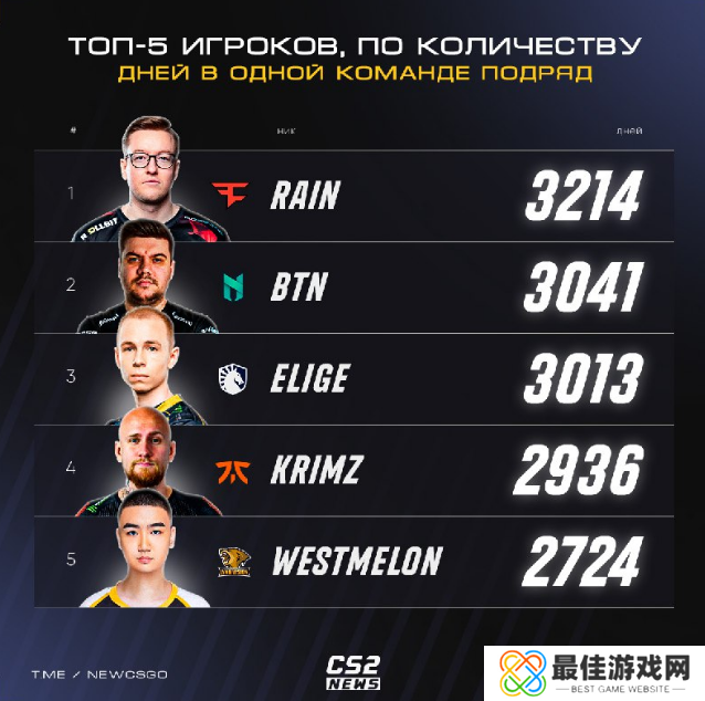 一起看看单支队伍效力时长排行吧。在CS世界中,不乏那些“从一而终”的职业哥们,他们在一家俱乐部度过了自己的青春时光,双方相互陪伴从少年成为青年,从青年来到中年。目前在一支队伍中效力时间最长的是rain