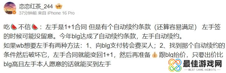 左手是1+1合同,但是有个自动续约条款(还算容易满足),左手签的时候可能没留意。今年BLG达成了自动续约条款,左手自动续约。