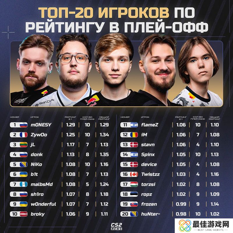 近日,有外媒统计了今年在各项赛事淘汰赛上表现最为优秀的TOP20选手数据,m0NESY和ZywOo排名前二。淘汰赛表现历来是HLTV在评选年度选手时,最为重要的考量标准之一。在这项数据上,在打完BLA