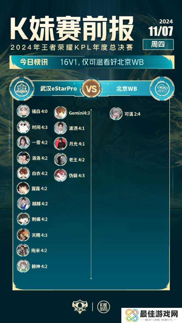 虎扑11月07日讯 仅可温一人看好WB,其他嘉宾全员看好ES!原文如下:2024KPL年度总决赛 淘汰赛D10【K妹赛前报】新鲜送达!eStar对战WB :16v1,仅可温一人看好北京WB。(预测收集