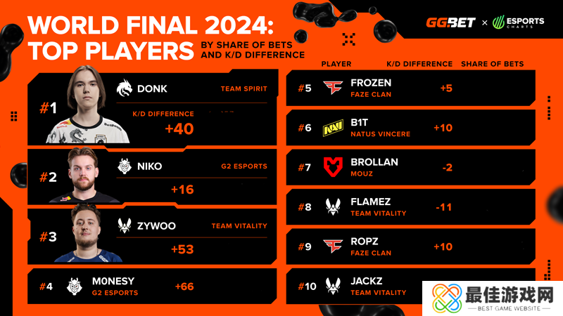在所有选手中,最受欢迎的是donk,随后是NiKo、ZywOo和m0NESY。6-10名分别是frozen、b1t、Brollan、flameZ、ropz和JACKZ。