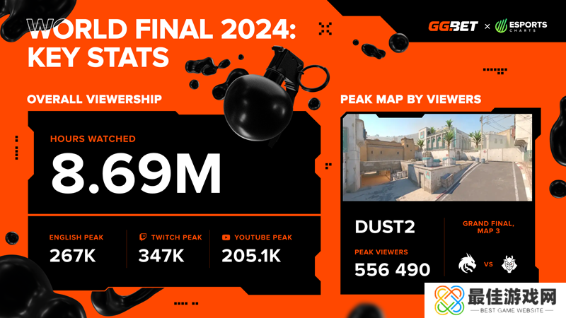 在总决赛的第三张也是最后一张地图上,比赛的峰值观众达到了556.5K。G2在BO5决赛中取得了决定性的胜利,他们成为冠军的道路上显得势不可挡,只用了三张地图就迅速击败了对手