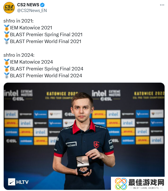 不过,sh1ro在2021年获得的冠军数量远不止此,他们获得了IEM 卡托维兹在内的总计7场大型赛事冠军。sh1ro也在当年获得了年度最佳选手TOP4荣誉。而在2024年,sh1ro仅获得3场大赛冠军,并且个人数据方面与2021年的自己相差甚远。
