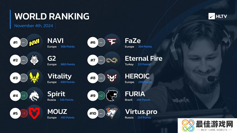 本次排名更新于2024年BLAST世界总决赛结束后,因此排名出现了部分变化,但世界前十总体上保持不变。