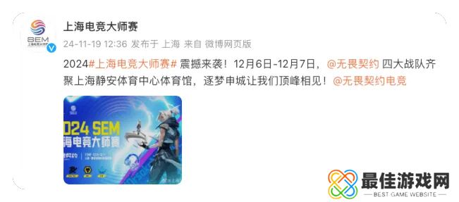 上海电竞大师赛官方宣布:本届上海电竞大师赛将于12月6日-12月7日举办。