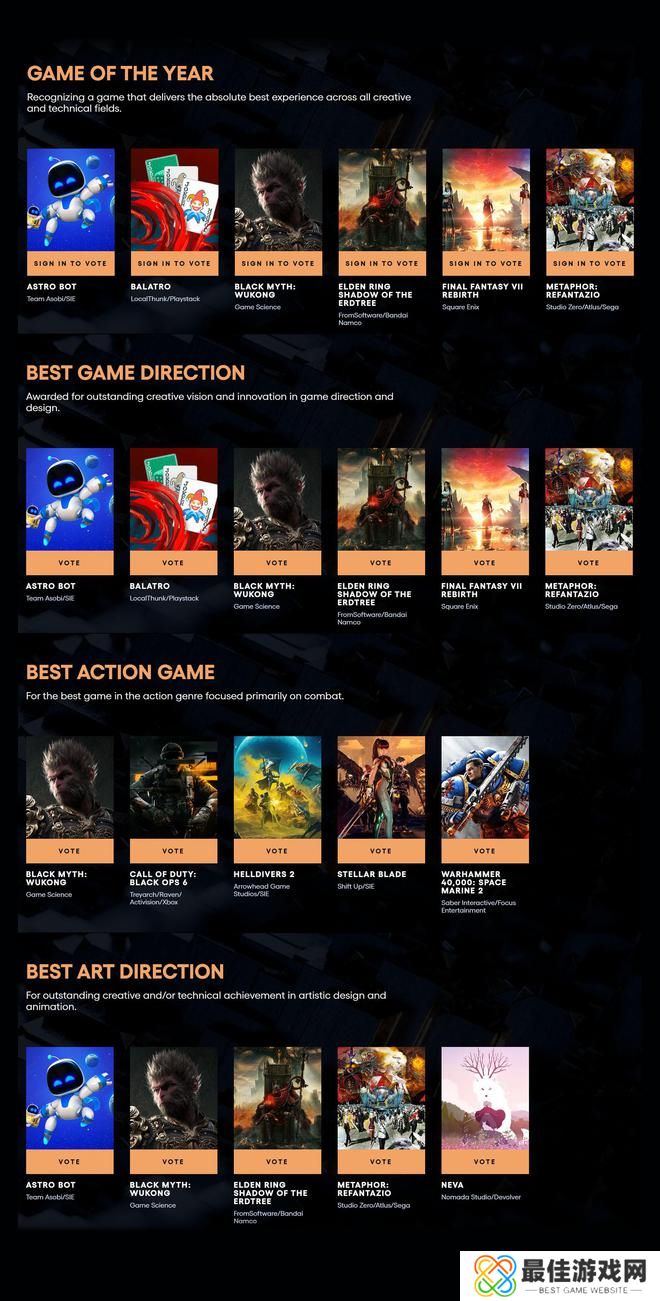 本届评选中的另一大亮点,则是国产单机动作游戏大作《黑神话:悟空》共获得4项提名,分别为:年度游戏大奖提名、最佳游戏指导大奖提名、最佳动作游戏大奖提名以及最佳艺术指导大奖提名。
