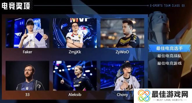 共有6位电竞选手获得年度最佳电竞选手提名,除了前面提到的在今年帮助EDG战队夺得2024无畏契约全球总决赛冠军、同时也当选总决赛最有价值选手的康康(游戏内ID:ZmjjKK)之外,还有CS2项目领跑2024大赛Rating的ZywOo、突破生涯魔咒夺冠的世界最佳指挥选手之一的Aleksib、DOTA2项目夺得2022、2024年TI冠军的33、带领T1卫冕英雄联盟S赛冠军的传奇选手Faker以及来自GEN的中单选手Chovy。