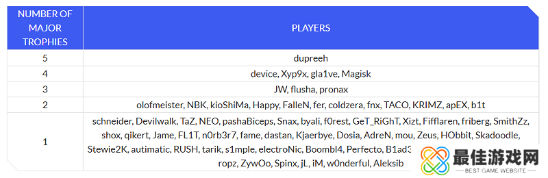 dupreeh是赢得CS:GO Major冠军最多的选手,他在Astralis四次夺冠,加入Vitality后又夺冠一次。