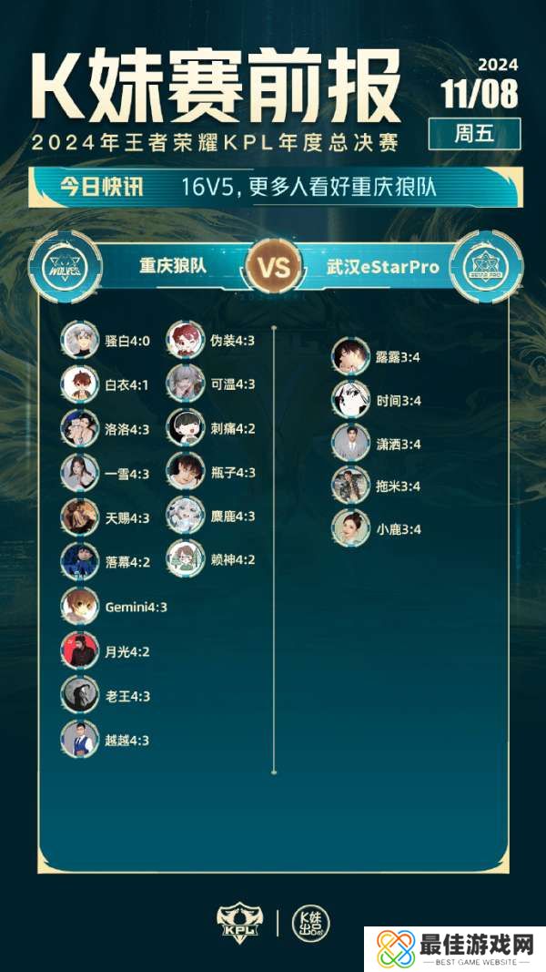 [K妹赛前报]月光等16人看好重庆狼队,仅5人看好武汉ES!