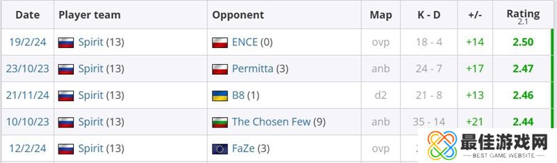 而在这场比赛中,Spirit队员donk打出了2.46 Rating、21-8 K-D、147.9 ADR的职业生涯第三高单图数据: