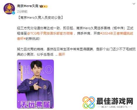 经三方充分沟通协商达成一致,即日起,南京Hero久竞选手景晚(杨中伟)正式租借至TCG电子竞技俱乐部官方微博 ,携手并肩,开启2024年王者荣耀挑战者杯的新挑战!