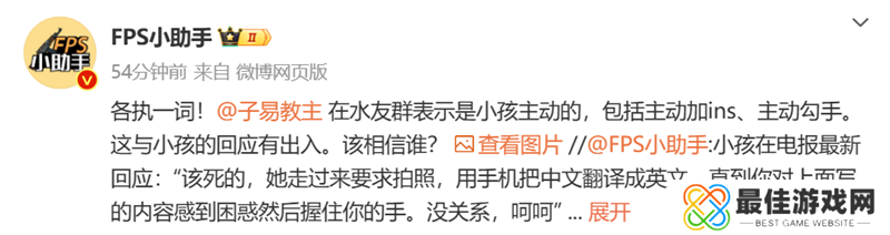 不过根据FPS小助手分享的消息,子易教主在水友群表示是小孩主动的,包括主动加ins、主动勾手。这与小孩的回应有出入。
